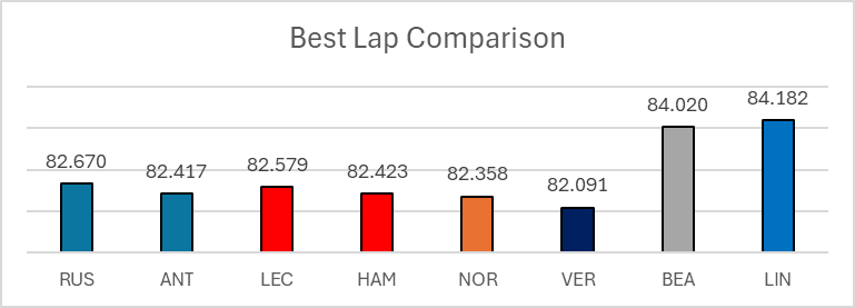 Mientras que Russell y Leclerc se mantuvieron competitivos en ritmo, pero con mayor variabilidad en sus vueltas.