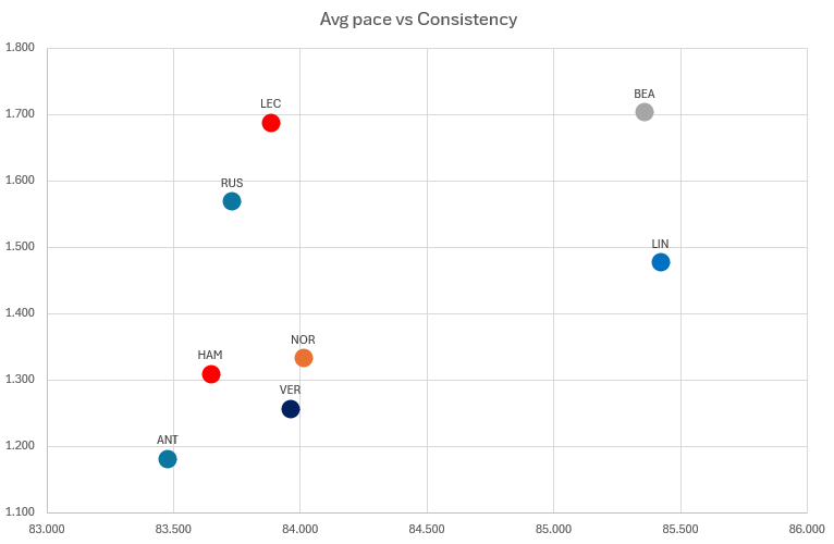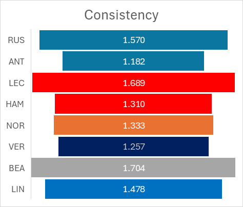 Antonelli no solo fue el piloto con mejor ritmo medio, sino también uno de los más consistentes, lo que refuerza la conclusión de que su rendimiento en carrera fue uno de los más completos del grupo analizado.