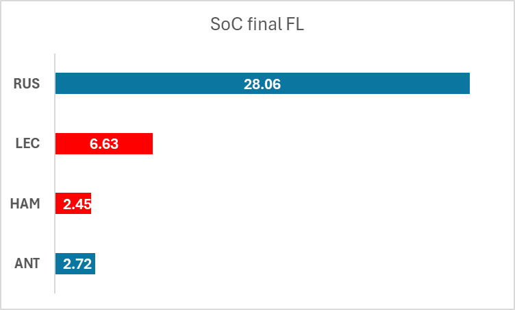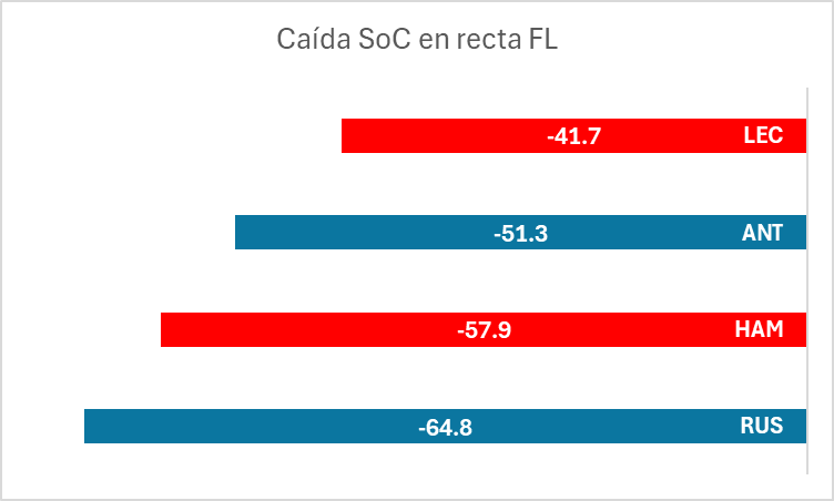 Russell utilizó un deploy más agresivo en recta, pero aun así terminó la vuelta con mucha más energía restante.