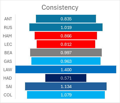 - Antonelli mantuvo un ritmo más estable durante todo el stint.